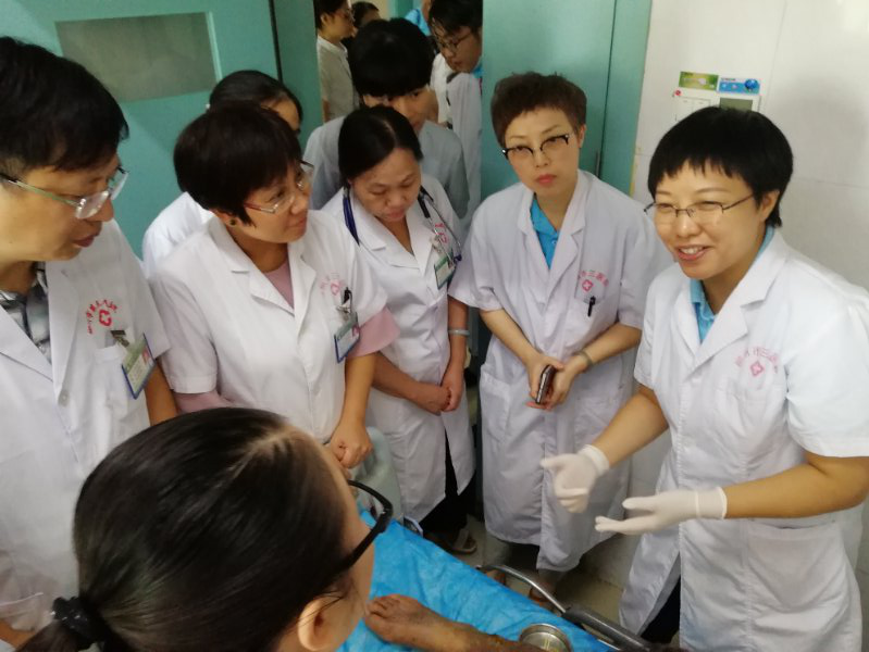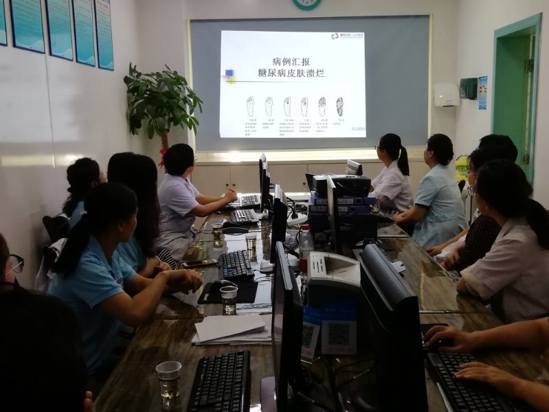 课后,主委周秋红、副主委尹红芳等在内分泌科刘鸿飞主任和护士长李娓的带领下来到病房开展了教学查房,并针对一名糖尿病合并静脉溃疡的老年糖尿病患者进行了医护联合会诊,共同讨论该患者的伤口护理方案,制定个性化糖尿病教育目标,探讨如何提高患者的治疗依从性,现场气氛热烈,赢得了患者和医务人员的一致好评。