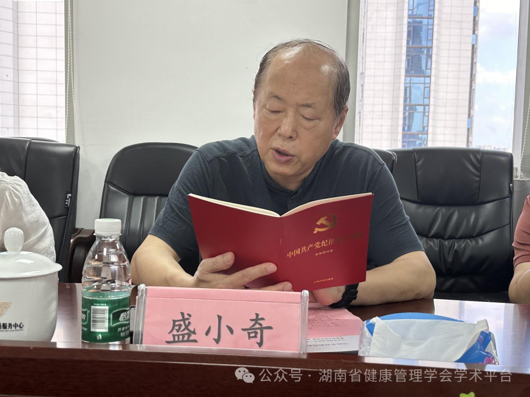 2024年7月4日下午,为深入学习贯彻总书记关于党纪学习教育的重要指示精神,全面贯彻党的二十大精神和二十届中央纪委三次全会精神,教育引导广大党员干部坚定拥护“两个确立”、坚决做到“两个维护”,持续强化广大党员干部党性修养和法纪意识。湖南省健康管理学会党支部开展了主题为“学条例 悟思想 守纪律 强党性 ”的书记讲党课活动。此次活动旨在通过系统的理论学习,引导党员干部坚定理想信念,增强党性观念。湖南省健康管理学会党支部书记副会长盛小奇、副会长兼秘书长易致远、党支部成员和秘书处工作人员参加学习。