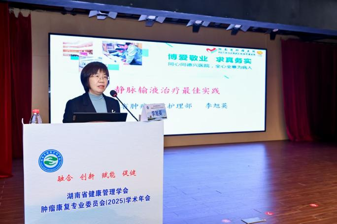 谭艳教授主持第二专场,蔡宏坤教授聚焦《健康中国背景下中医在肿瘤康复中的重要角色》,详述中医特色疗法的应用优势与临床成效,为中西医结合肿瘤康复提供新思路。随后,李旭英专家分享《静脉输液治疗最佳实践》,紧扣临床前沿技术与创新理念,内容兼具专业性与实用性。