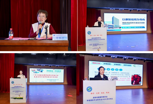 彭丽教授和雷春沙教授共同主持案例分享专场,聚焦临床实践难点。谷梅教授《一例胸壁骨肉瘤胸壁重建术后合并重症肺炎脱机困难患者的康复护理策略》、李莎萍教授《基于沙盘游戏疗法的认知行为治疗在肿瘤患者严重心理问题应用中的案例报告》、汤芙蓉教授《一例放射性脑病的康复之路》、谢伟兰专家《以康复结局为导向的胃癌术后营养方案动态调整》、卿利敏教授和陈美琳教授《一例口腔癌皮瓣移植修复重建术后患者吞咽障碍康复管理实践》及李水冰教授《一例免疫相关重度剥脱性皮炎患者的精准护理干预与康复支持》,通过典型病例生动展示护理难点突破与创新实践成果,为临床工作提供宝贵借鉴。