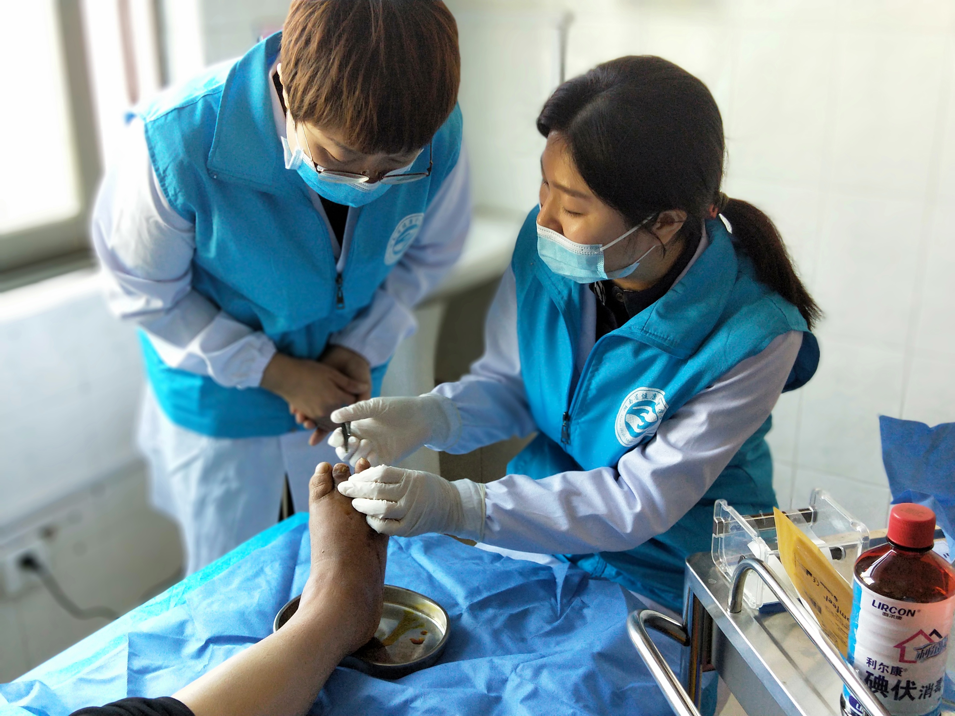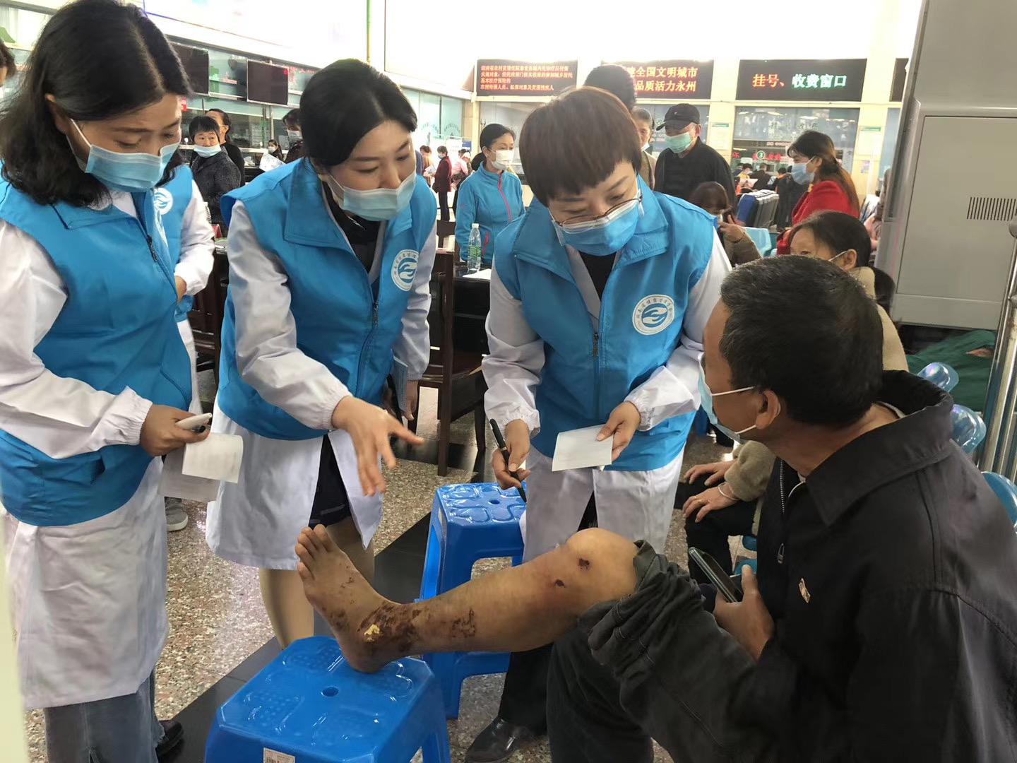14日上午,志愿者团队一行随专委会副主任委员、永州市第三人民医院内分泌科潘慧妍主任前往该院门诊一楼大厅进行大型糖尿病义诊活动。周秋红主委、潘慧妍副主委、黄洁副主委、胡慧玲副主委、李金花副主委、申小兰副主委、孟巍秘书等耐心为大家提供义诊、咨询、糖尿病足风险筛查等工作,同时为患者发放宣教资料、讲解糖尿病及其并发症相关预防及自我护理等相关知识。此次义诊活动还免费为大家测量血压、血糖、糖化血红蛋白,前来义诊的市民约300人,测量血糖约280次,糖化血红蛋白约60次,检查糖尿病足的患者约50人次,义诊结束后,志愿者团队随周秋红主委到伤口造口门诊及内分泌科病房进行现场指导伤口换药,查看了一例糖尿病足的患者的伤口,对局部清创、敷料选择和后续治疗提出了专业建议,传授宝贵经验。