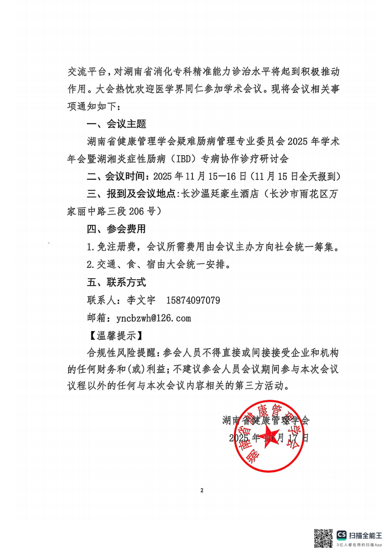 关于召开“湖南省健康管理学会疑难肠病管理专业委员会2025年学术年会暨湖湘炎症性肠病(IBD)专病协作诊疗研讨会”的通知