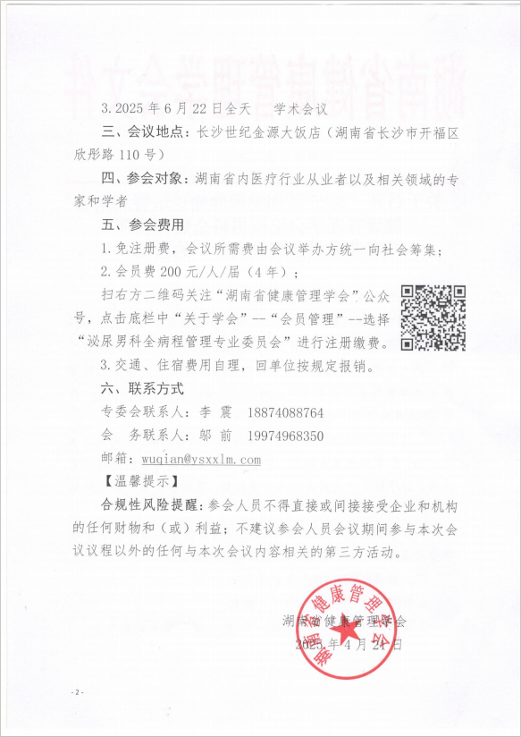 关于召开“2025潇湘泌尿肿瘤论坛暨湖南省健康管理学会泌尿男科全病程管理专业委员会成立大会”的通知