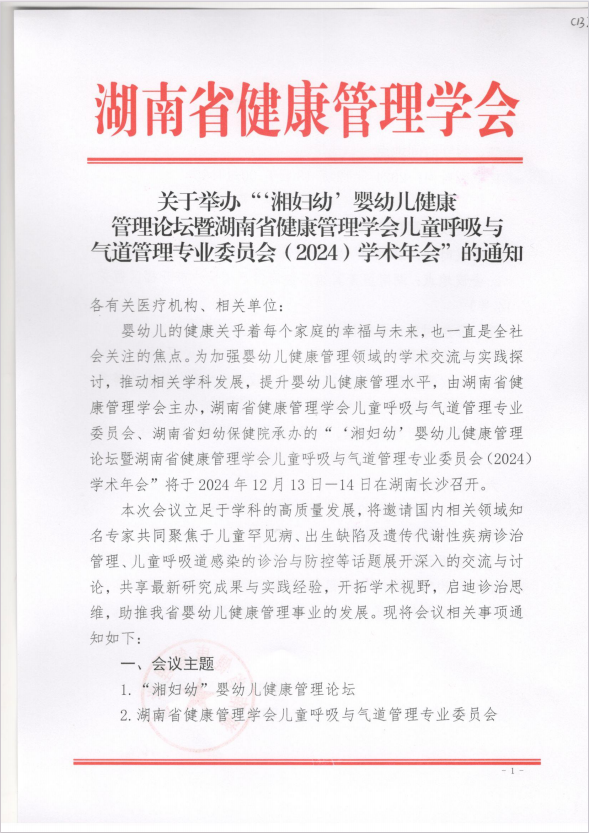 关于举办“‘湘妇幼’婴幼儿健康管理论坛暨湖南省健康管理学会儿童呼吸与气道管理专业委员会(2024)学术年会”的通知