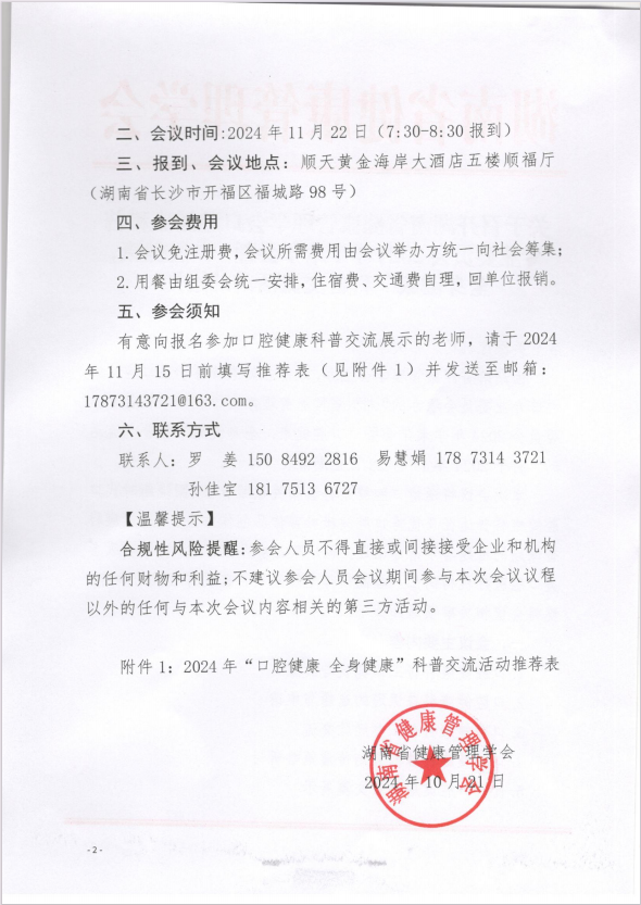 关于召开湖南省健康管理学会口腔健康科普专业委员会2024年学术年会暨“口腔健康,全身健康”科普交流活动的通知