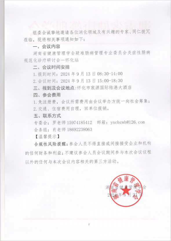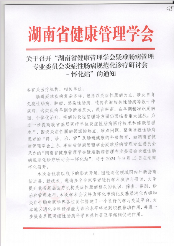 关于召开“湖南省健康管理学会疑难肠病管理专业委员会炎症性肠病规范化诊疗研讨会-怀化站”的通知