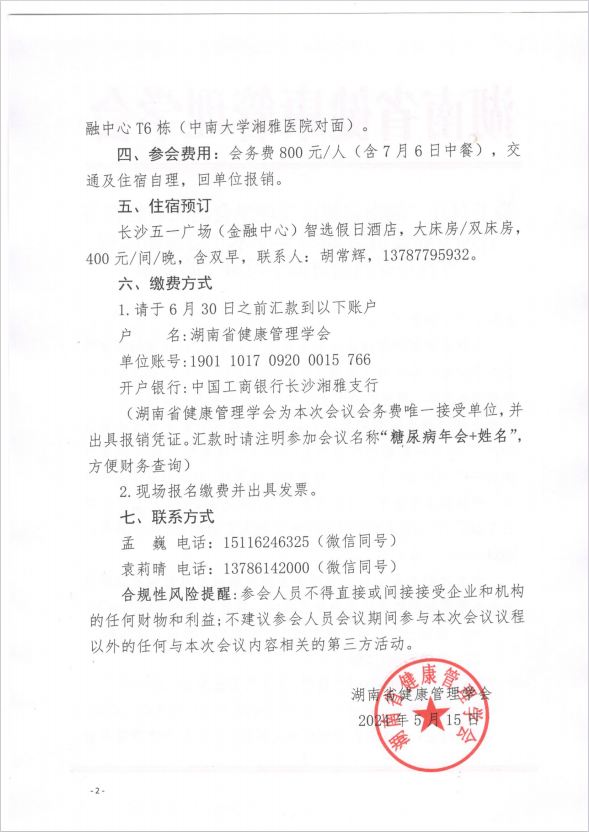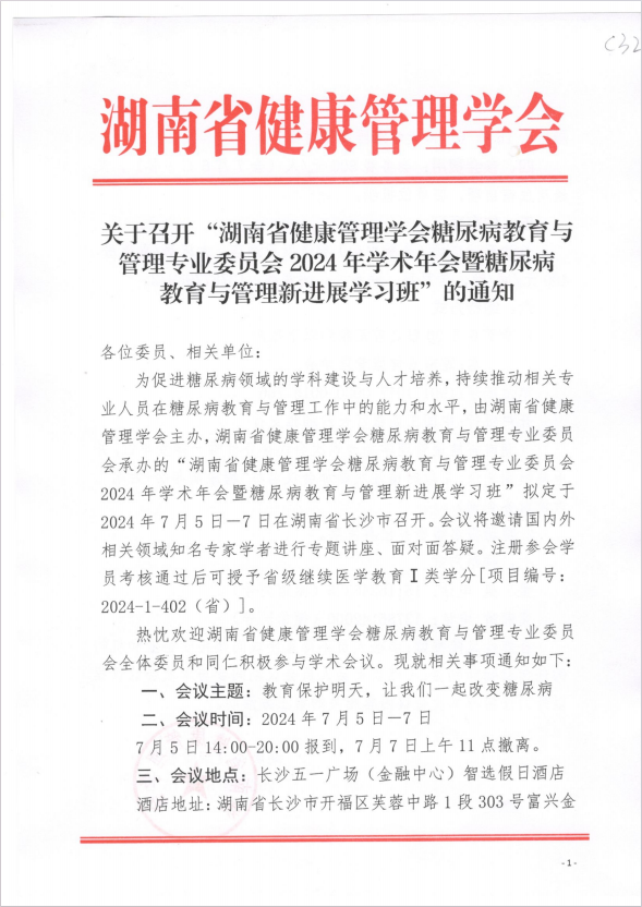 关于召开“湖南省健康管理学会糖尿病教育与管理专业委员会2024年学术年会暨糖尿病教育与管理新进展学习班”的通知