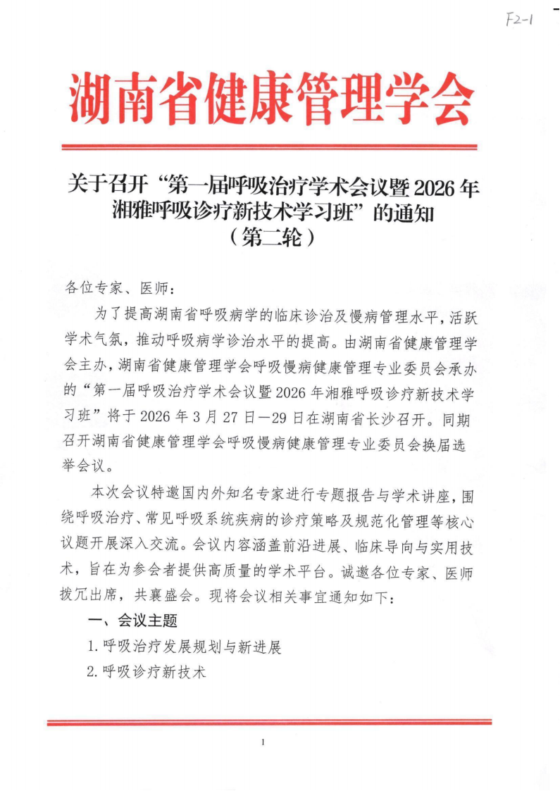 关于召开“第一届呼吸治疗学术会议暨2026年湘雅呼吸诊疗新技术学习班” 的通知(第二轮)