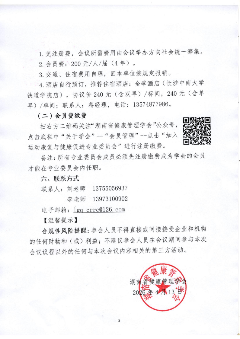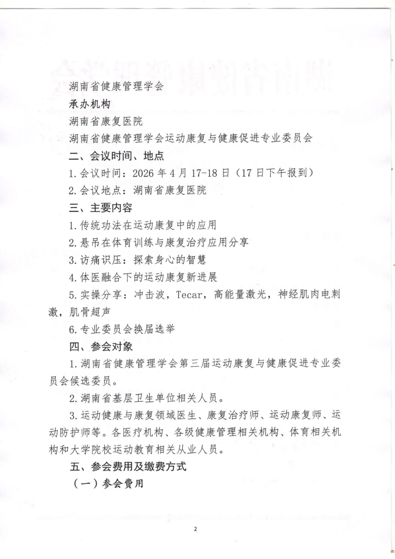 关于召开“湖南省健康管理学会运动康复与健康促进专业委员会2026年学术年会暨换届大会暨体医融合新进展培训班” 的通知(第二轮)